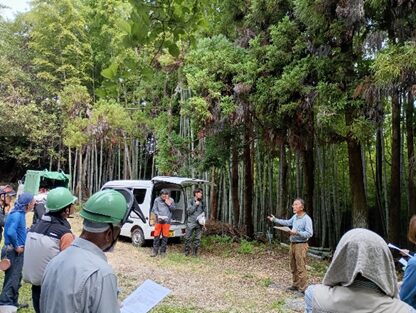 (株)ミロクテクノウッドや高知県、南国市との協働の森づくりとして進められている南国市十市の南国市有林での竹林整備研修会を行い、16名が参加しました。高知大生や地域おこし協力隊などの参加を得て、竹林整備の基礎知識を学ぶ有意義な研修会となりました。