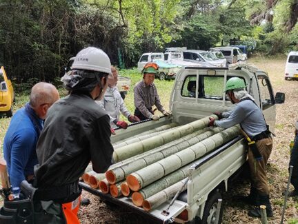 今回の目的は、南国市民や県民からも愛される森づくりに向けての竹林整備と併せて、ミロクテクノウッドへの資材としての原竹の搬入の検証作業も大きな目的でした。