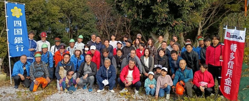 (株)四国銀行と高知県、香南市、救援隊の4者の協働の森づくり協定に基づき整備している野市総合公園にて、協働の森づくりとしての里山整備の研修会を開催し55名が参加しました。班に分かれていただいて整備作業を行いました。