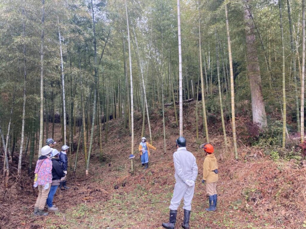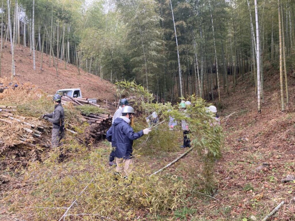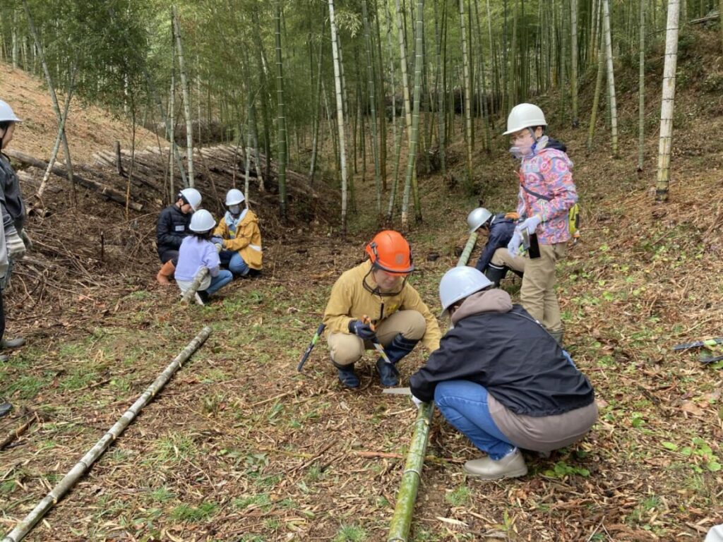 実施前に作業内容の確認を行い、ボランティアへ竹の伐り方や竹炭作りの方法を指導し、実践しました。