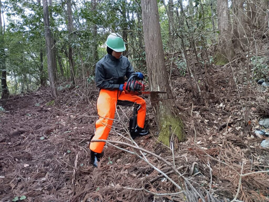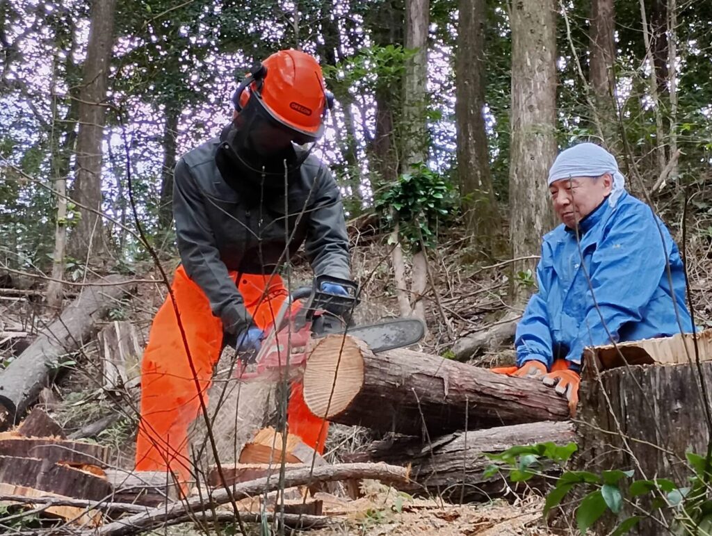 伐採木整理の玉切り作業