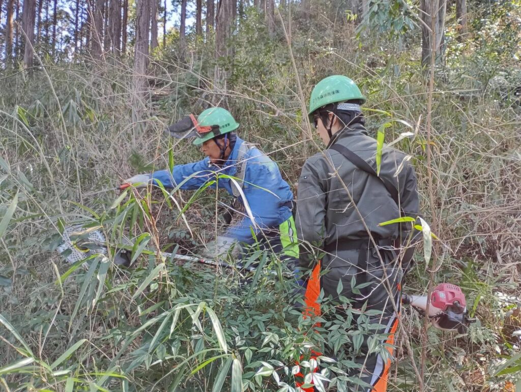 土佐山運動公園の裏山には、針広混交林化を目指してオンツツジやモミジ、コナラなどの広葉樹が植えられており、笹薮を刈り込んでいく際にはそれらの苗木を傷めないような配慮が求められます。